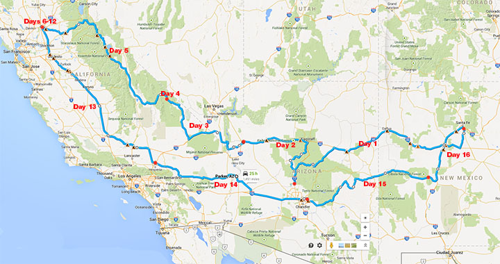 Spring 2015 Motorcycle Trip: Santa Fe, NM, to Sacramento, CATotal miles: A little over 3000