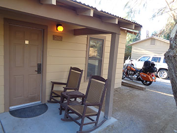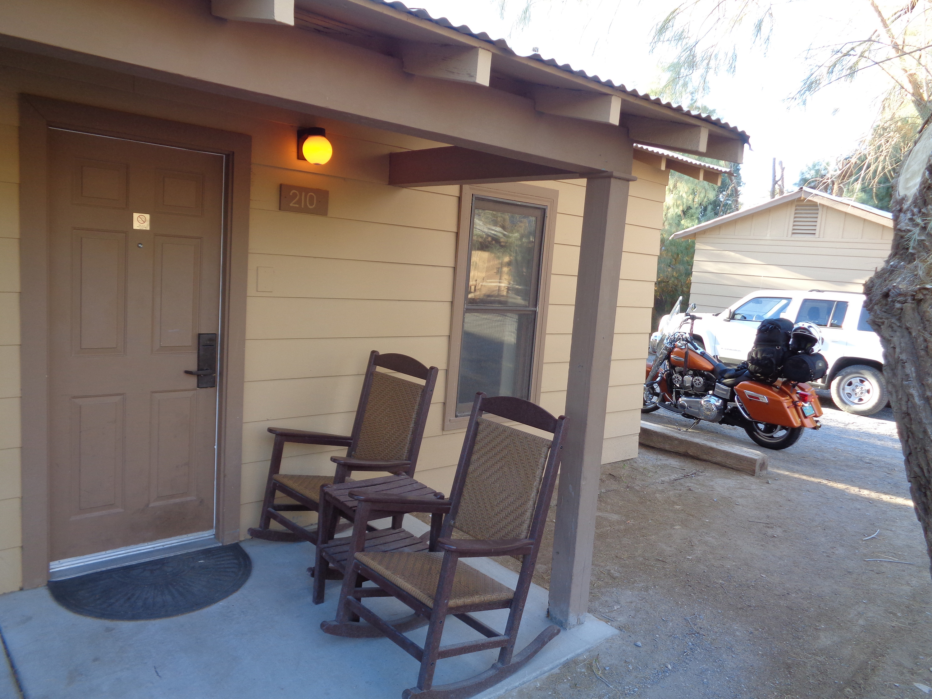 | I pulled into the registration lot at the Furnace Creek Ranch in late afternoon and shut down the engine of the Switchback with the Love-Jugs cooling fans I had installed prior to my trip howling, which attracted some attention from non-motorcycle types strolling the area. Distance for the day had been about 300 miles. My accommodation for the next two nights was one of the comfortable duplex cabins with parking conveniently located just to the right of the registration lobby and an easy walk to the little plaza with outdoor entertainment, a gift shop, and restaurants. | ||