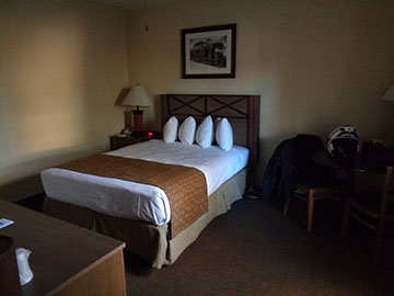 There was a small motel just across the street from the gas station, but it appeared to be deserted. No action in the lobby, a "No Vacancy" sign posted, and only a couple of vehicles in the lot. Walking a bit further down the main street, on the other site, I found the High Country Lodge, which appeared to be a working motel, although of ancient vintage. The lady desk clerk, one of the owners I think, arrived at the lobby to greet me. There were plenty of rooms available and I took one for the night with cash payment of $55. The lady let me borrow her cell phone to call Eileen and tell her what was happening. Fortunately, the High Country Lodge also had WiFi, so there was hope of summoning help in the morning via my MacBook computer.