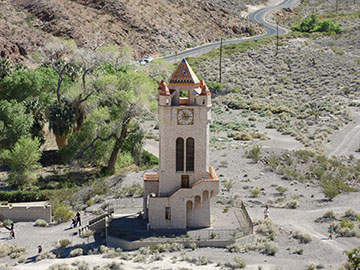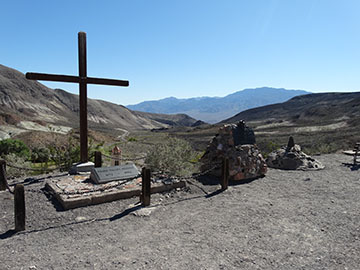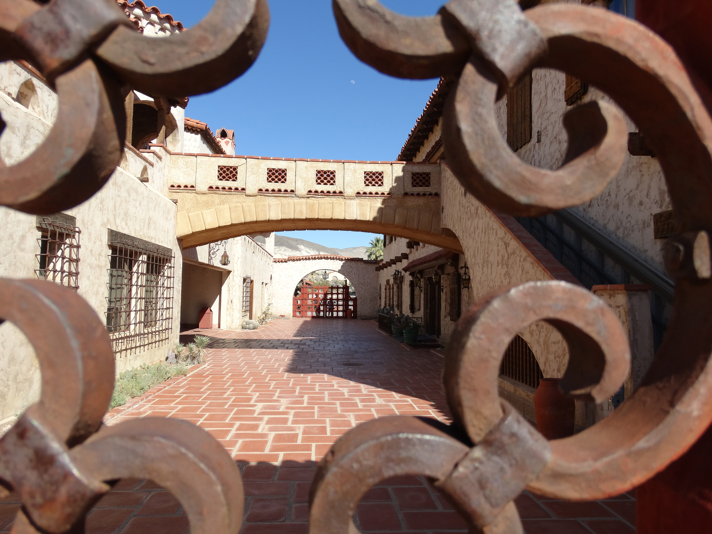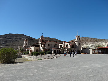 | From Zabriskie Point I rode back past the historic Furnace Creek Inn to the gas station just beyond my cabin at Furnace Creek Ranch, fueled up the bike, and headed north on CA 190 through the valley, Scotty's Castle, about 50 miles away to the north, my destination for a visit. Along the way I rode a loop around Daylight Pass Road and Beatty Road, just for fun, then northward on the long road to Scotty's. Sweeping views of mountains and the valley are beautiful along this route, but become a bit boring considering the distances, which tempted me to push the speed limits a bit, especially on the return trip to Furnace Creek. At Scotty's Castle I parked in the shade under some trees with a group of BMW motorcycles and hiked the property including the hill to Scotty's gravesite, taking photographs, but demurring on the organized tour of the buildings. The tours were popular and I would have had to wait at least two hours to get a spot in one, so in the interest of a timely return to the Ranch for dinner, I decided to content myself with the exteriors. I hadn't seen Scotty's Castle on my earlier visit. The residence has an interesting history, well covered by the book that I picked up in the gift shop about the character associated with building the unfinished mansion, Death Valley Scotty by Hank Johnston. | ||