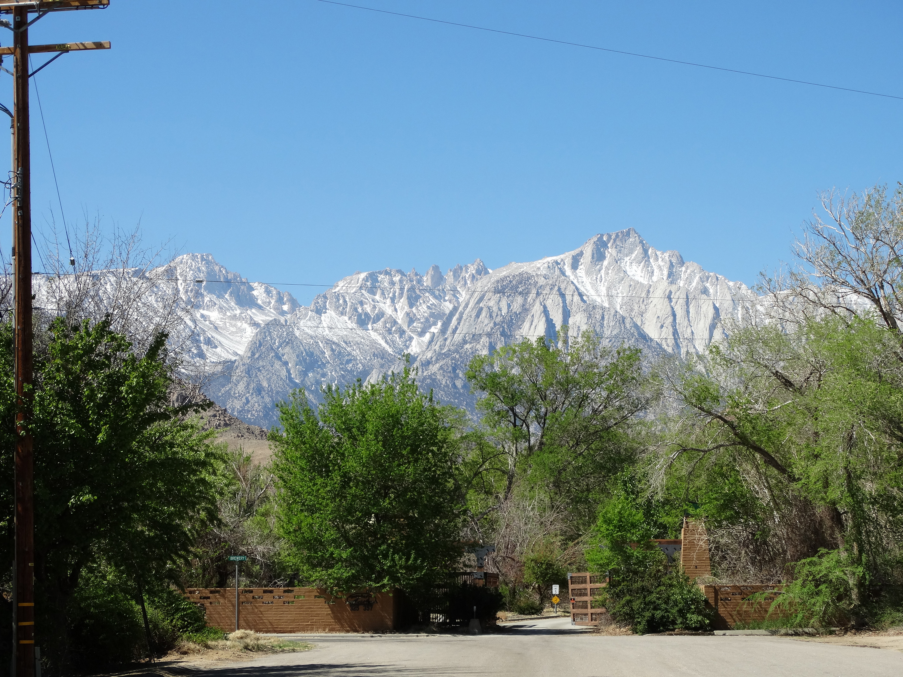 Day 5Sunday, March 29, 2015After another delicious buffet breakfast, I packed up the bike and hit the road about nine in the morning. California Highway 190 heading westward and out of the national park is a fun motorcycle road, with sweeping curves, long vistas, and a few twisty sections. For a distance I followed two other riders on Harleys, one of which appeared to be a black Switchback, similar to my bike. We pulled out at a viewpoint where there was a large group of other riders, and the rest allowed for some lively conversation. Of the two I had been following, the lady was riding the 2012 Switchback with, she said, about 50,000 miles on the odometer. Her husband was riding a Harley Ultra Classic Electraglide similar to my other bike. They were headed home to Los Angeles. A number of other riders in the group were from towns closer to Death Valley. I stopped for gas in Lone Pine. Another rider, Mike, struck up a conversation at the station. I mentioned my plan to ride north and most likely, assuming the pass was open as I expected, to leave US 395 at California Highway 89 and ride over the Monitor Pass into Markleeville before continuing on to US 50 in South Tahoe. Mike was headed south, but we both knew of the old saloon in Markleeville that I had visited years before during a ride to Tahoe from the San Francisco Bay Area. It was famous for its funky atmosphere and items of female undergarments festively hung from the ceilings. Before leaving Lone Pine, I rode down one of the little residential side streets and snapped some photos of Mount Whitney, with an elevation of 14,505 feet the highest point in the contiguous United States, with my large Sony camera with the 50x optical Zeiss zoom lens. Amazingly, Death Valley, with a low point of 282 feet below sea level, the lowest point in North America, and this high point are separated by only about 85 miles. |