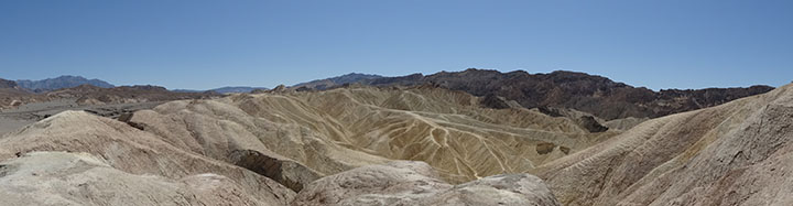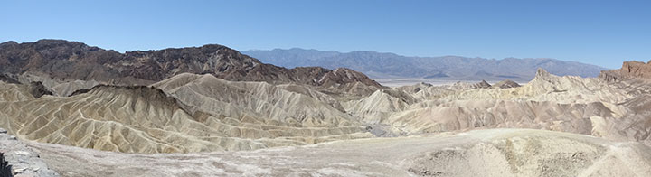 Day 4Saturday, March 28, 2015After a healthy buffet breakfast of eggs, sausage, and biscuit, I made a quick ride back along CA 190 on which I had entered the part to Zabriskie Point and walked the short uphill path to the observation point taking photographs. Unfortunately, the desert bloom I had hoped to see during my visit this last week of March, usually the best time of year for wildflowers in Death Valley, was virtually nonexistent, doubtless a symptom of the severe drought conditions affecting California and the West. My only previous visit to Death Valley had been about the same time of year in the late 1990s when I had ridden my 1993 Kawasaki Concours for a day trip from Victorville, where I had traveled for business meetings with a client. I don't remember the exact year, but it was one of the wettest in history in California, and the display in Death Valley that year was touted as a "100-year bloom." THe pretty blankets of small colored blossoms coating the desert floor that year were markedly different from what I found on this year's visit. Somewhat disappointing to say the least. |