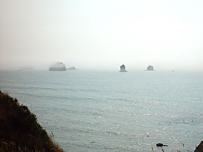 I got this one shot of offshore rocks peeking through the fog just past Port Orford. After that the marine layer hanging on the coast became so thick I could barely see the road, let alone the scenery. And it was cold! About 50 degrees F to be exact. The temperature combined with the dampness of the fog to make the ride downright miserable. Heated grips and heated seat turned on, I stubbornly resisted fishing the heated jacket liner out of my luggage and started looking for a route inland, of which there were virtually none until I crossed into California and reached the junction with US Hwy 199.