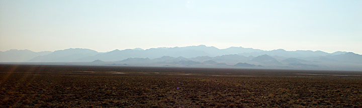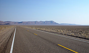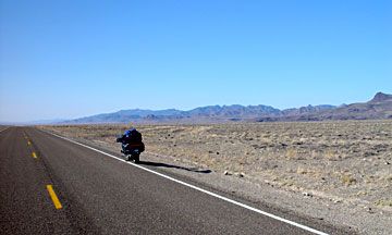 I rode on from Warm Springs, still looking for breakfast. The cafe at Rachel was open, but did not appear inviting enough to motivate me to maneuver the K1200LT up the gravel drive and across the gravel parking area. I pretty much resigned myself to lunch in Utah in lieu of breakfast in Nevada. In spite of the fact that these hundreds of miles of Nevada desert are nearly devoid of humanity, there are excellent high-speed two-lane blacktop highways. The desert scenery is beautiful, as seen in my few photographs below. Nevada highway 375 ends at the junction with US 93 after 110 miles or so. A half hour on US 93 north took me to Caliente, Nevada, a civilized outpost with a nice cafe, the Knotty Pine Restaurant and Lounge, where I found my breakfast. I arrived at 10:25 AM, and breakfast was served until 10:30 sharp -- no exceptions. |