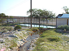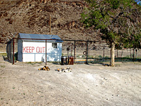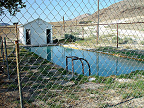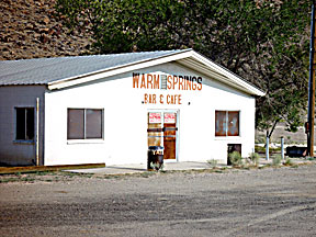 Day 2: Tonopah, Nevada, to North Rim, Grand CanyonI passed on breakfast in Tonopah and hit the road just after 7 AM. Riding east on US highway 6, the sun was in my eyes, but the cool desert morning air was invigorating. I planned to stop for breakfast along the way -- possibly in Warm Springs at the junction of US 6 with Nevada 375, the "Extraterrestrial Highway." Wrong! Warm Springs turned out to be another ghost town. A few vacant buildings with the windows broken out, and a boarded up bar and cafe. The warm springs are still there. A stream of hot water edged by white mineral deposits runs down a hill into a man-made pool. However, the pool is fenced, the bathhouse is gutted, and a sign proclaims in large red letters, "KEEP OUT." There was not a soul in sight, and Warm Springs on Sunday morning was eerily silent except for the odd car or semi that rolled through the junction every five minutes or so as I walked around snapping photos.