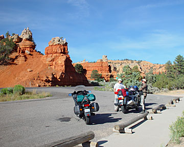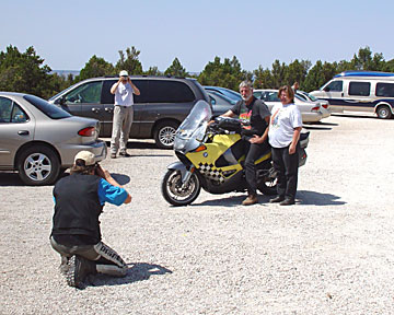 We walk the short trail back to the parking area where we meet this retired couple from Iowa who have logged over 100,000 miles on their 1998 K1200RS. Paul and Boris create a photo op by convincing them to back their bike out for a pose. |