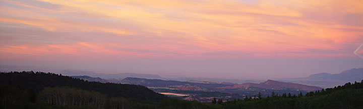 After lunch we ride north on US Alt 89 to US 89, with a quick stop for gas in Kanab, Utah. We turn eastward on Utah highway 12, and stop for a rest just before passing Bryce Canyon National Park. Boris and I trade bikes for a short stretch. I had never ridden an ST1100, and I am amazed at how light and maneuverable it feels -- more like the Katana 600 I had for a few years than the Concours. Although Boris informs me that the ST1100 actually weighs more than the Concours. How does Honda do that? It's the same with the Gold Wing and the K1200LT. Although the Gold Wing almost certainly weighs more, it is a much easier motorcycle to ride. Paul and I stop for a moment because Boris has dropped from sight behind us on my K1200. Finally, he reappears and waves us on. I get to thinking: did I remember to fasten the strap holding my camping gear on the passenger seat before I turned the bike over to Boris? This question continues to torment me. Finally I pull to the side and ask Boris what the delay had been. He tells me he saw a strap flapping loose in the wind and had to tuck it in. Ahah! I was right! The camping stuff is just sitting on the seat behind him. Good thing he was using it as a backrest. I fasten the strap, and we trade back. The ST1100 was fun to ride, but I am accustomed now to the massive feel of the K1200LT, and I am missing it. We ride off, stopping a while later to watch the Utah sun set behind the Escalante Mountains. |
