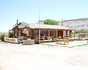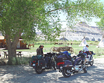 We rode a bit farther east, out of the Park, and found this little cafe, Luna Mesa, for breakfast. Even though it was nearly noon, getting breakfast was no problem. The food was good and very reasonably priced. Our waiter and cook was a recent transplant from California who had come here a few months before to help a friend with the restaurant and just stayed. The horses were unfenced, but seemed content to stay on the property. The teepees are available as accomodations for the night.