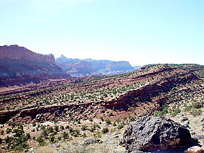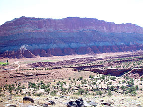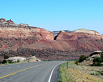 As the highway turns northeast toward Blanding, it winds up and through the dramatic cut in the ridge seen in the photo at right.