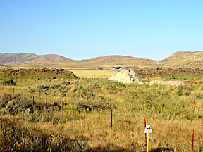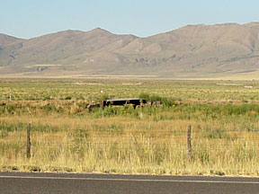 Day 7: On into IdahoI hoped to visit my friends Karen and Andy and their family in Boise, Idaho. I had called them a couple days earlier, but discovered they had planned a weekend trip to McCall. However, they were not leaving until early afternoon on Friday, August 16. So if I could get to their house by noon, we could at least visit for an hour or two before they left. In anticipation of this, I was up and away from Brigham City early, about 7:30 AM. The morning air was brisk and dewey. I rode west on Utah highway 83, a two-lane road, through Corinne toward Promontory. The visitor center at the Golden Spike Site did not open until 9 AM, I had read somewhere. However, I hoped to ride up there and look around even though I would probably have to split before 9 if I expected to get to Boise by noon. The was a fair amount of commuting traffic on highway 83. There were no signs for Promontory, but many signs for Thiokol, which I discovered was not a city, but instead a large plant where Thiokol Corporation builds rocket propulsion systems. It's a very rural area, and Thiokol is the biggest thing out there. Running parallel and just to the left of highway 83 was the original trackbed of the transcontinental railway. It is now abandoned and there are no tracks, but the raised grade of the original line is still visible, although overgrown with grass. There are occasional wooden bridges where the track passed over small streams. Just past the road to Promontory, the grade becomes significantly elevated and makes a sweeping turn to the left as it heads up toward the summit. The grade in the turn is broken by a large gap where presumably a trestle, now gone, supported the track. |